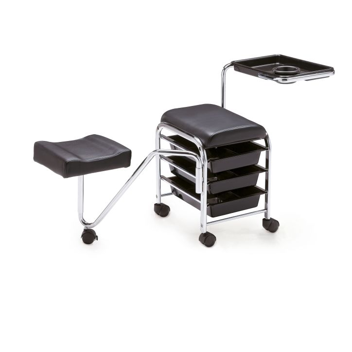 Carrello professionale nero con seduta poggiapiedi integrata, progettato per offrire comodità e ordine durante qualsiasi trattamento estetico. Dotato di tre cassetti capienti, permette di organizzare perfettamente strumenti, accessori e prodotti, mantenendoli sempre a portata di mano. La struttura stabile e compatta lo rende ideale per centri estetici, saloni e studi professionali.
