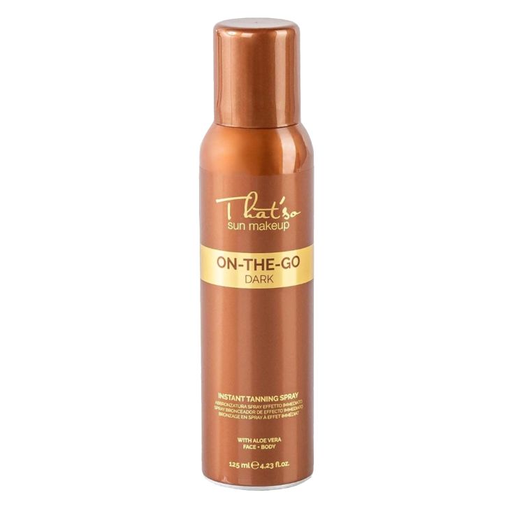 On The Go Dark è lo spray abbronzante ad azione idratante per viso e corpo che regala un’abbronzatura intensa ed immediata, grazie al pigmento naturale bronzo-dorato. Arricchito con Aloe Vera per una pelle morbida e luminosa, On The Go Dark di That’so garantisce un’abbronzatura uniforme, senza macchie e striature, grazie al pratico applicatore spray ad erogazione continua che consente la facile vaporizzazione del prodotto direttamente sulla pelle, senza bisogno di spalmarlo.